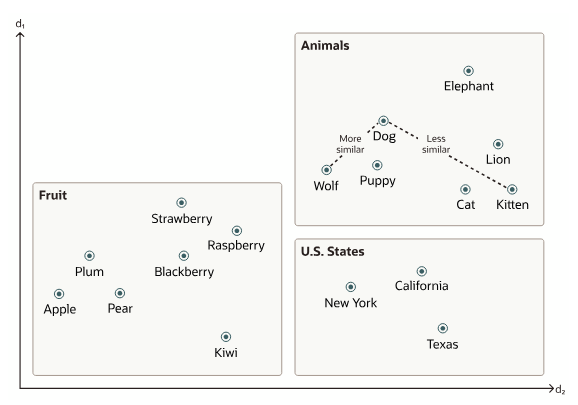 이제 데이터 세트에서 의미론적 유사성을 검색하는 것은 기존의 키워드 검색 대신 벡터 공간에서 가장 가까운 이웃을 검색하는 것과 같습니다. 다음 다이어그램에서 볼 수 있듯이, 이 벡터 공간에서 개와 늑대 사이의 거리는 개와 새끼 고양이 사이의 거리보다 짧습니다. 이 공간에서 개는 고양이보다 늑대와 더 유사합니다.