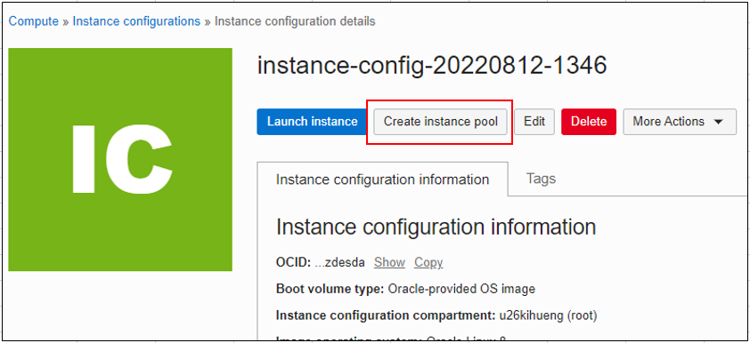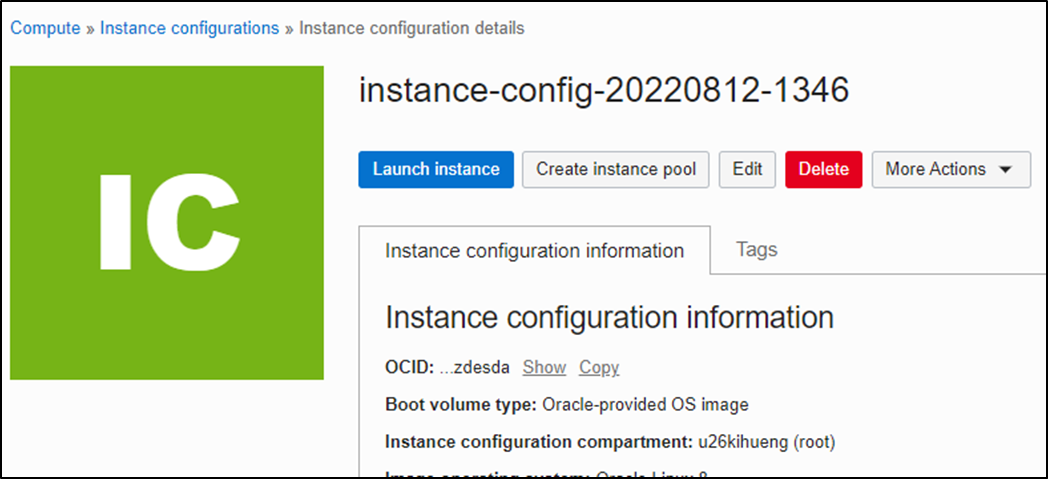 Instance Configuration이 생성되면 아래처럼 조회할 수 있다.