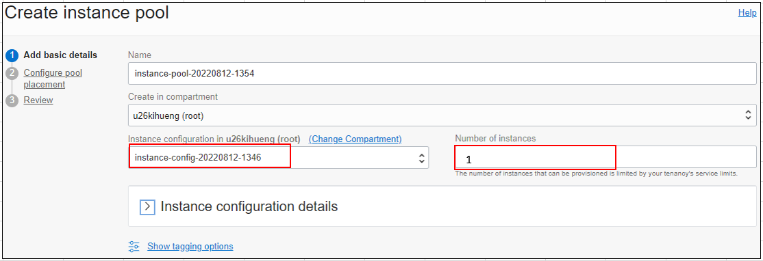 Instance Configuration선택하고 Instance Pool이 프로비저닝할 때 초기Instance 수를 지정한다.