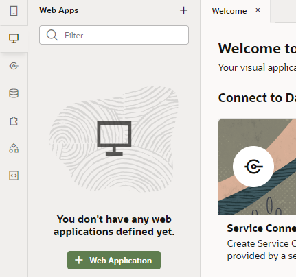 시각적 응용 프로그램에 있는 각 웹 응용 프로그램의 구조적 표현이 웹 응용 프로그램 창에 표시됩니다. 웹 애플리케이션이 생성되지 않은 경우 메시지와 + 웹 애플리케이션 버튼이 표시됩니다