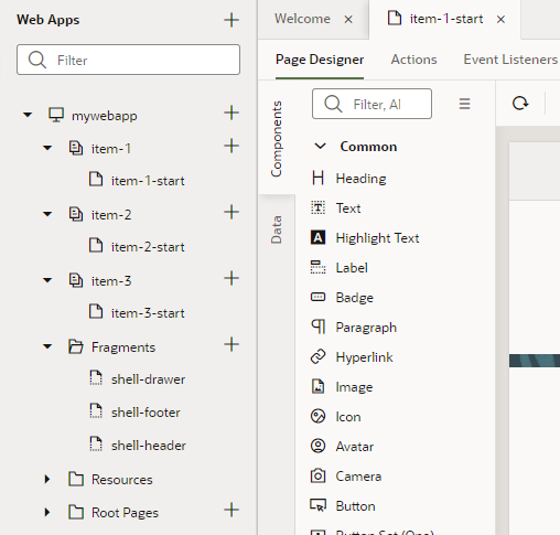예를 들어, 웹 애플리케이션을 클릭하면 네비게이터의 웹 애플리케이션 탭이 열립니다. 다른 탭은 모바일 어플리케이션 서비스, 비즈니스 오브제트 (데이터 소스), 추가 콤포넌트, 프로세스 클라우스 서비스 입니다.