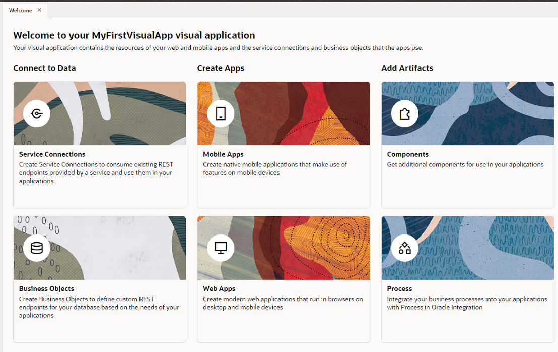 3. 새로운 프로그램을 생성하면 시작 화면이 표시됩니다. 새로이 생성된 프로그램에는 아티팩트가 포함되어 있지 않지만 마법사는 기본적으로 응용 프로그램의 파일 구조와 일부 리소스 및 파일을 생성합니다. 시작 화면을 사용하여 먼저 생성할 아티팩트를 결정할 수 있습니다. 시작 화면에서 타일을 클릭하여 아티팩트를 만들고 관리할 수 있는 네비게이터의 패널을 열 수 있습니다. 여러 모바일 및 웹 앱을 추가할 수 있으며 모든 앱은 데이터 소스에 액세스할 수 있습니다.
