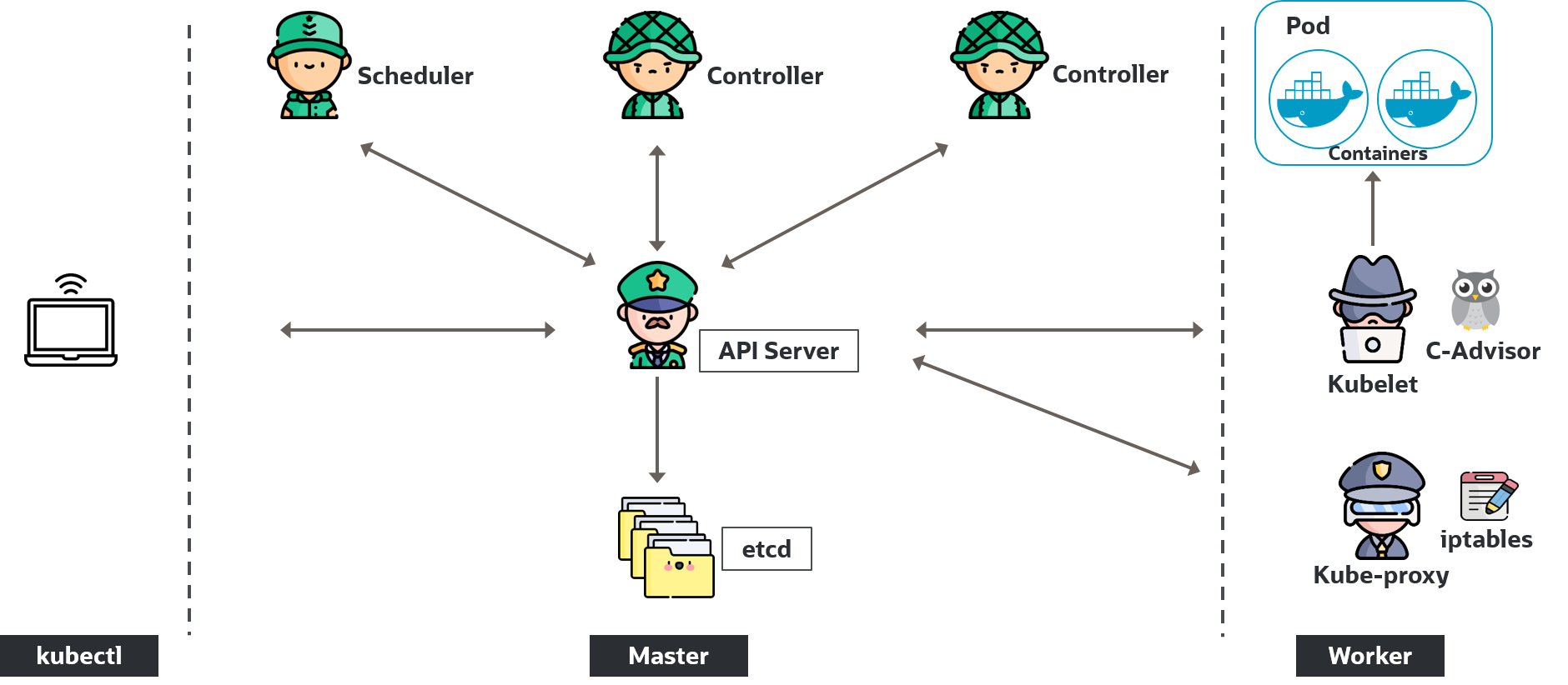 • API Server: Client 요청을 받음(kubectl). Etcd 정보와 함께 scheduler에게 어느 node에 pod를 생성 할 지 문의. Controller에 불꽃감시 지시/보고받음