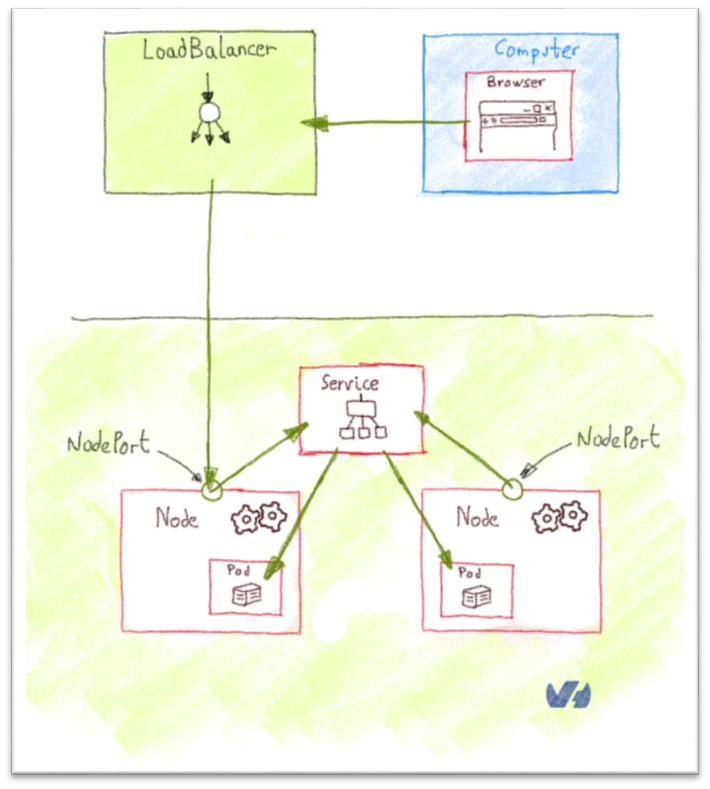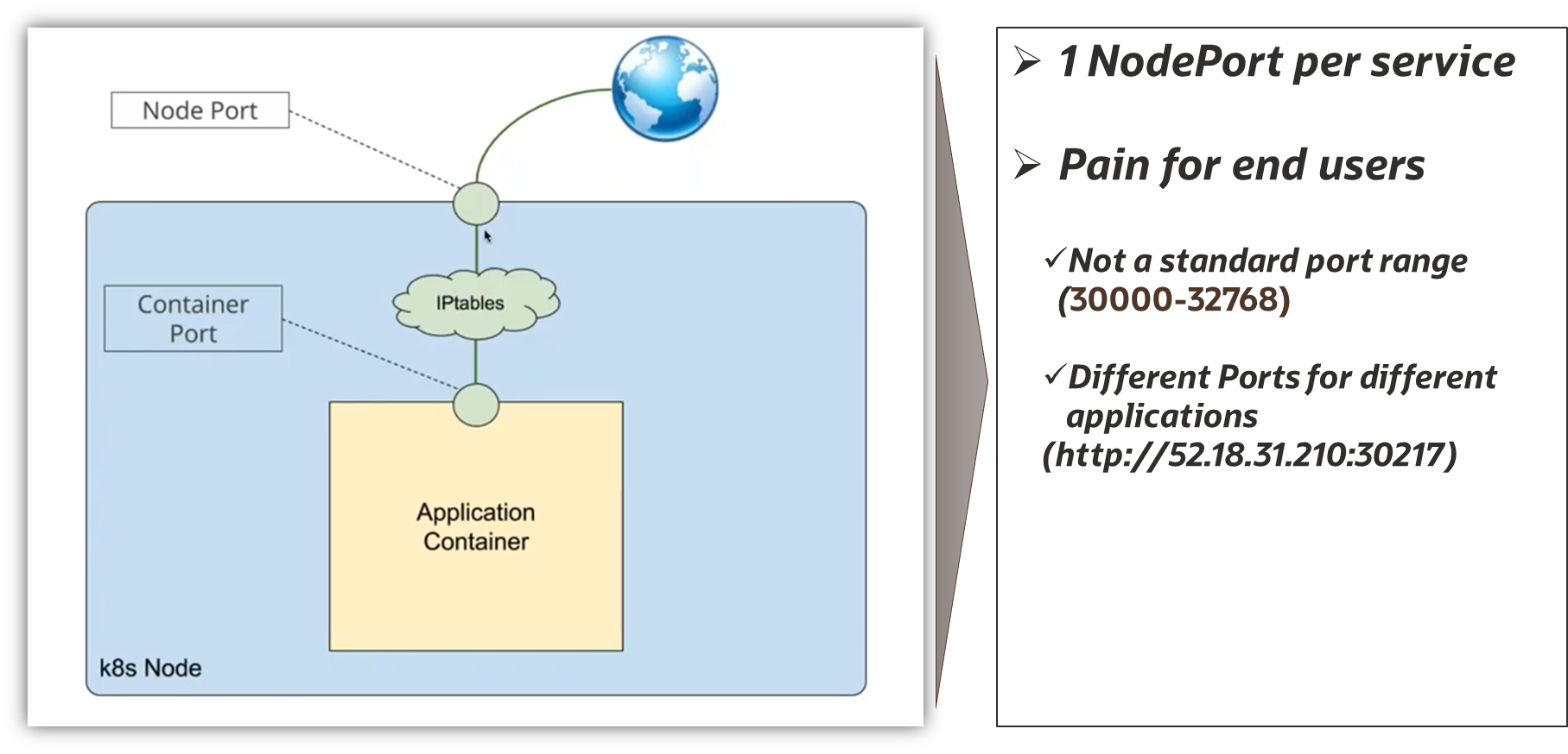 • NodePort: 고정 포트(NodePort)에서 각 노드의 IP에 대한 서비스를 노출합니다. <NodeIP>:<NodePort>를 요청하여 클러스터 외부에서 NodePort 서비스에 연결할 수 있습니다.