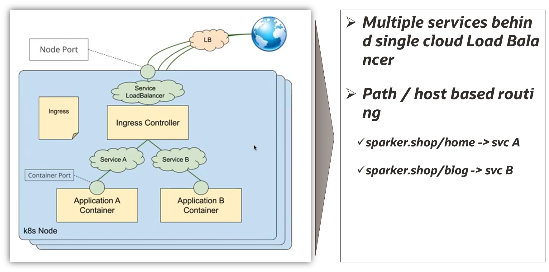 • Ingress: 클러스터 외부에서 서비스로 HTTP 및 HTTPS 경로를 노출합니다. 트래픽 라우팅은 Ingress 리소스에 정의된 규칙에 의해 제어됩니다.