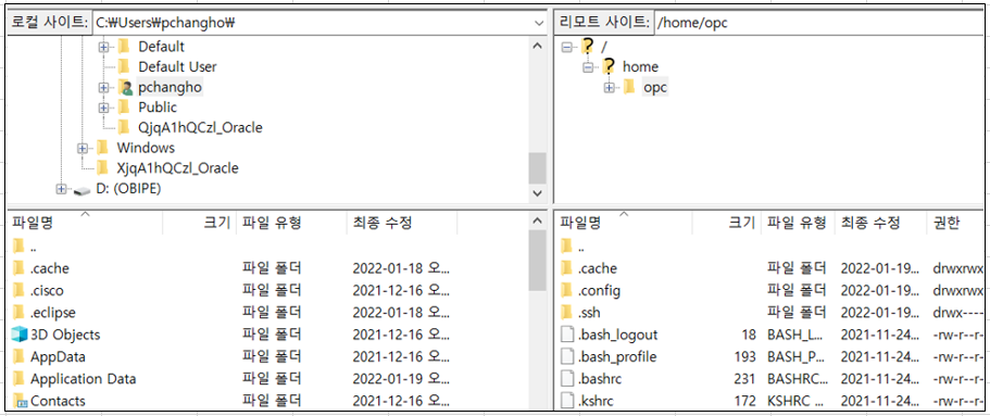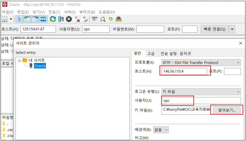 FileZilla를 띄우고 아래처럼 Compute Instance에 접속합니다. 키파일은 ppk파일을 선택합니다.