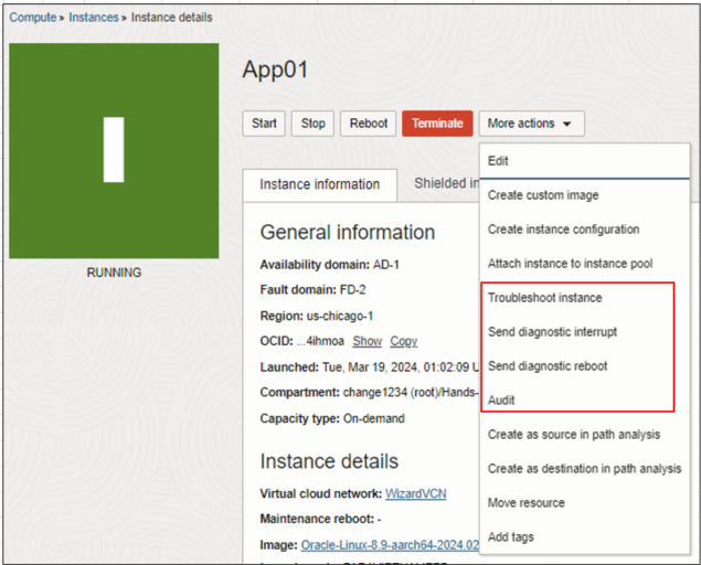https://docs.oracle.com/en-us/iaas/Content/Compute/Tasks/sendingdiagnosticinterrupt.htm - Send diagnostic reboot: 다른 해결시도 실패시 Trobleshooting을 위한 diagnostic reboot(진단 재부팅)