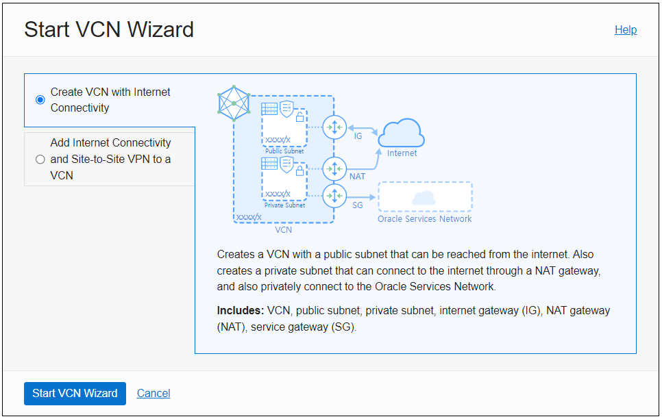 둘째로 Start VCN Wizard를 통해서 만들 수 있습니다. 이 방식은 NW구성에 필요한 기본적인 요소들을 한번에 만들어 줍니다. VPN이 필요한 NW구성을 하고자 한다면 두번째인 Add Internet Connectivity and Site-to-Site VPN to a VCN을 선택하면 됩니다.