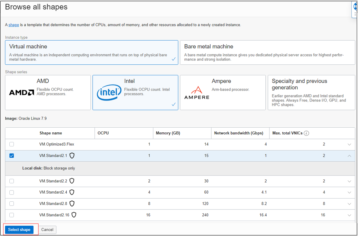 Shape는 Instance Type과 Shape series를 선택할 수 있습니다. 이 두가지를 간단히 설명하면 다음과 같습니다.
