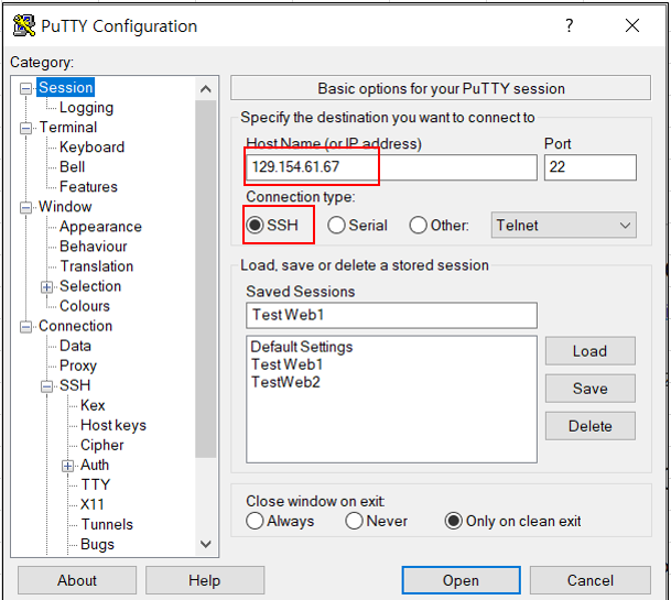 IP address를 입력하고 Connection type으로 SSH를 선택합니다