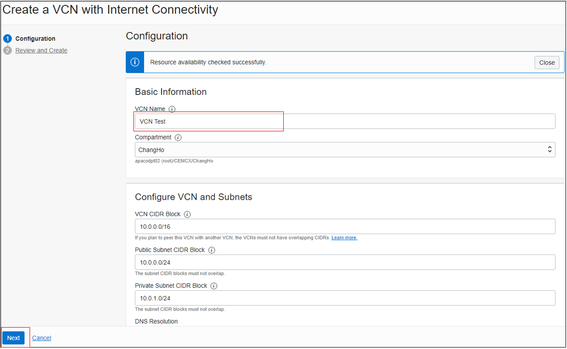 | Note. Configure VCN and Subnet 부분에 VCN, Public Subnet, Private Subnet의 각 CIDR Block이 설정되었습니다. Public CIDR Block과 Private CIDR Block은 서로 중복되면 안되며 VCN CIDR Block내에 존재해야 합니다 |