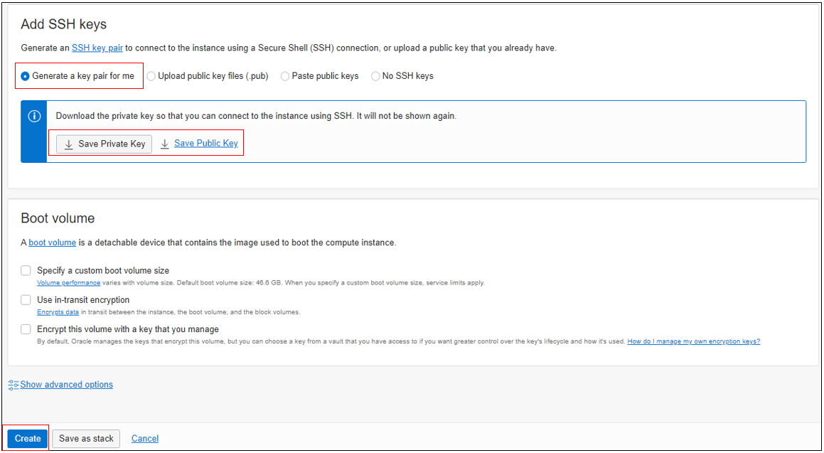 Compute Instance에 접속할 수 있는 SSH key pair을 Down받고 Create버튼을 눌러 Compute Instance를 생성합니다.