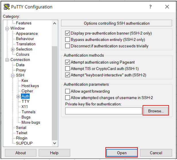 SSH > Auth를 선택하고 좀전에 변환한 Private key ppk파일을 선택하고 Open을 누룹니다.