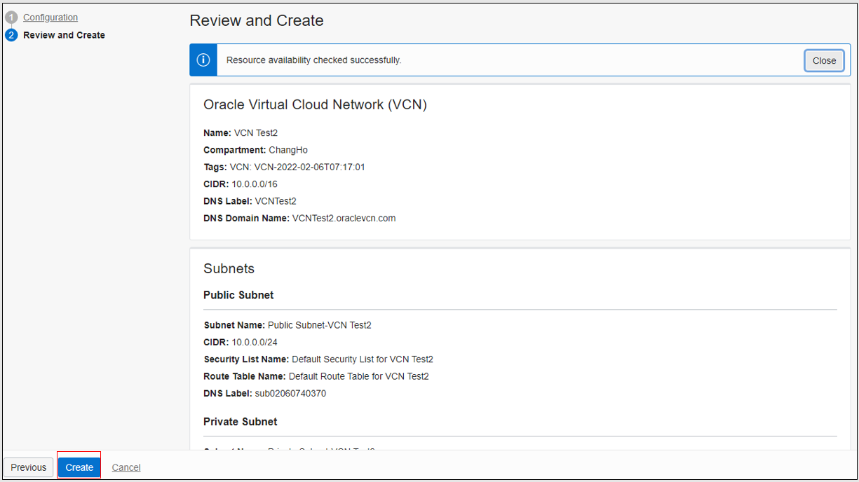 생성이 되는 VCN 요소들이 나열됩니다. Create를 눌러 VCN을 생성합니다.