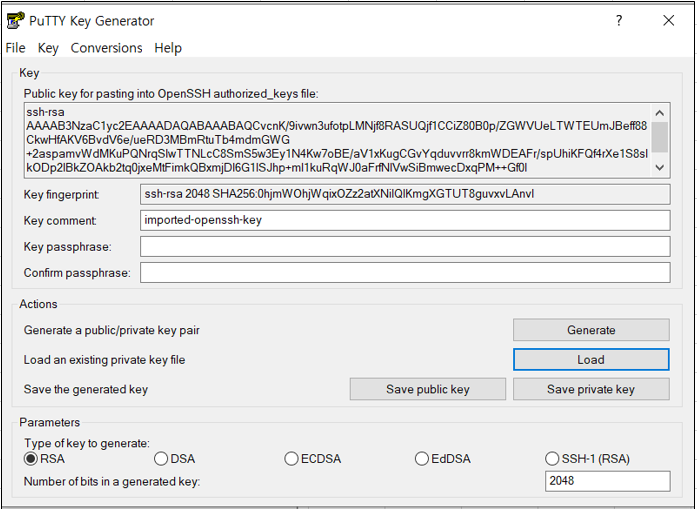 Load버튼을 눌러 private key를 선택하고 Save private key를 눌러 ppk파일로 변환합니다.