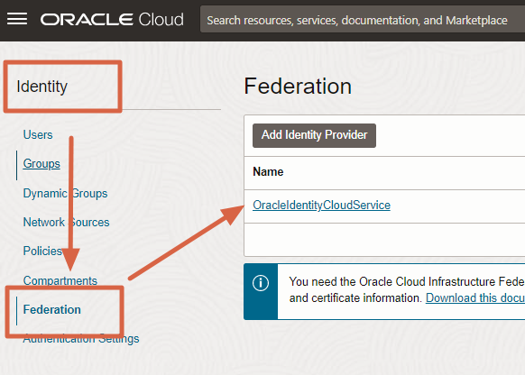 1. OCI 콘솔 로그인 후 Identity - Federation - OracleIdentityCloudService 선택, 상세 정보 페이지에서 Oracle Identity Cloud Service Console 링크 확인 후 연결