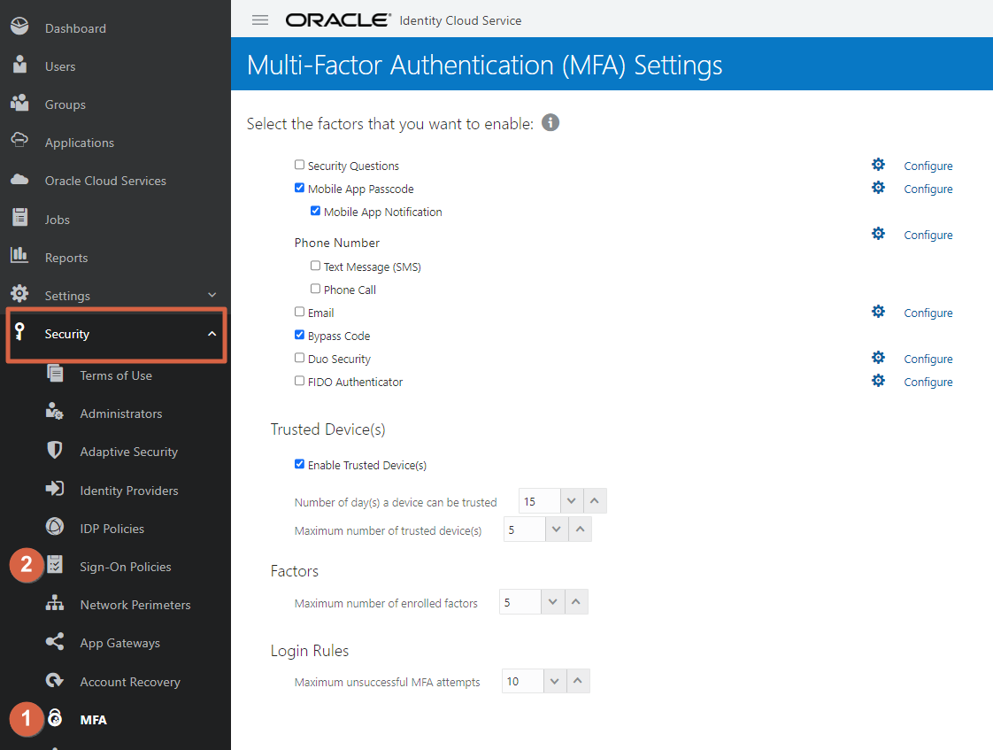 2. IDCS 서비스 콘솔에서 Security - MFA로 이동
