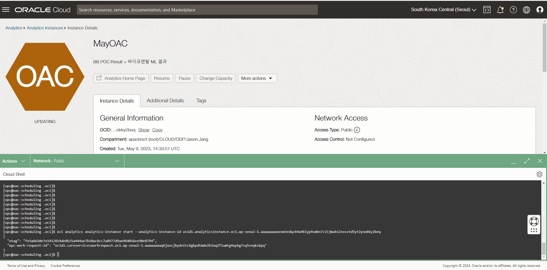 oci analytics analytics-instance start --analytics-instance-id ocid1.analyticsinstance.oc1.ap-seoul-1.youroacocid
