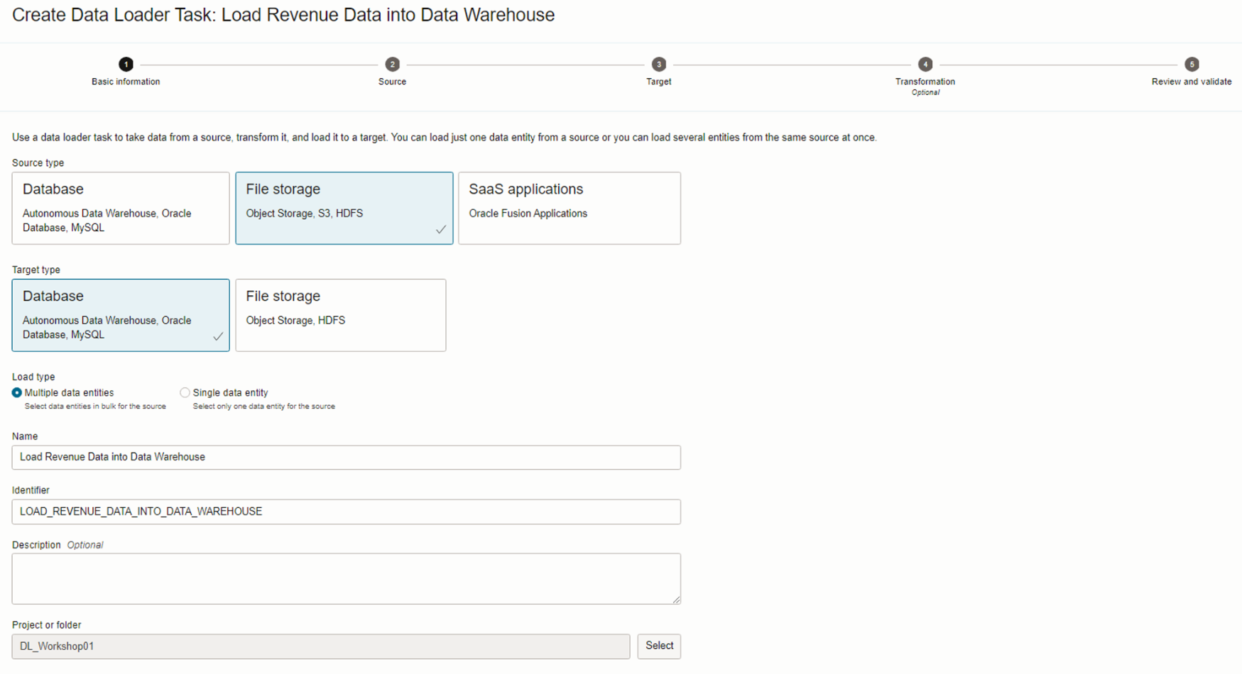 Source Object Storage와 Target ADW를 선택하고 Load Type를 Multiple Data entities로 지정합니다. Next를 클릭합니다.