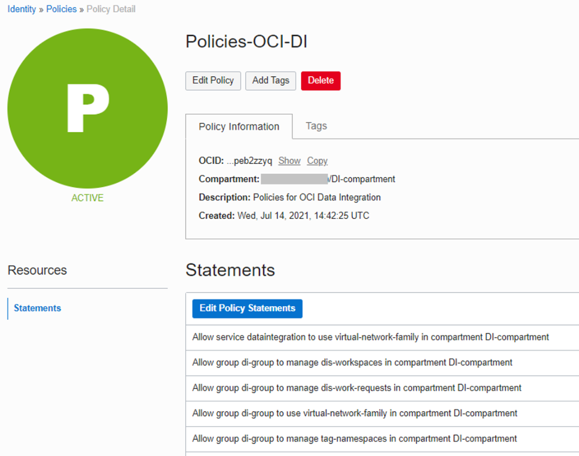 현재 Compartment (DI-compartment)에 Data integration service를 위한 권한과 DI-GROUP에 권한을 부여하고