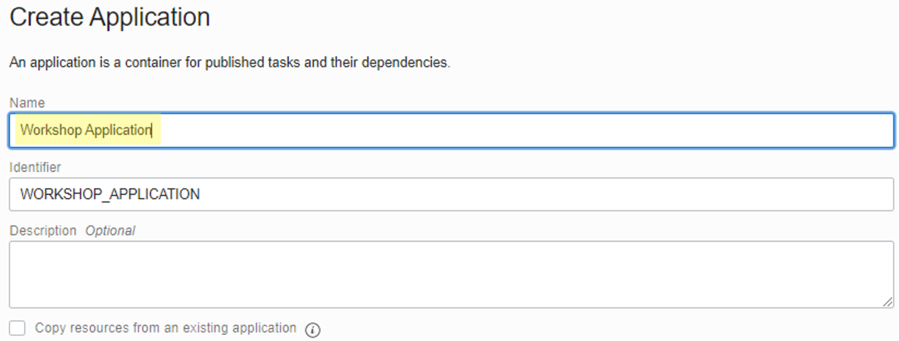 앞으로 생성할 Task가 Publish 될 Application을 생성합니다.