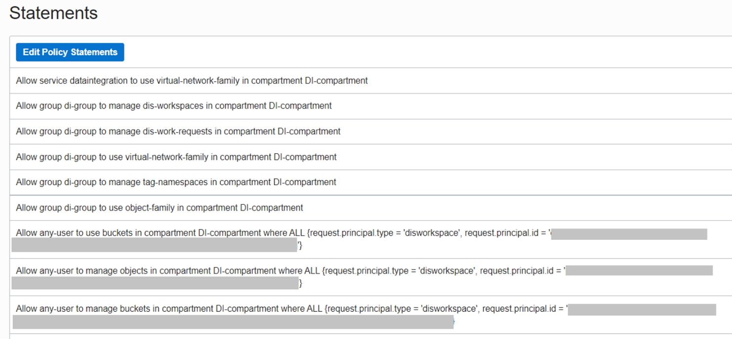 Data Integration Task에서 사용될 Source ADW와 Target Object Storage의 Data Asset을 구성하기 전에 필요한 권한을 설정합니다. 아래 Statement의 request.principal.id는 앞에 생성한 Workspace의 OCID를 지정합니다.