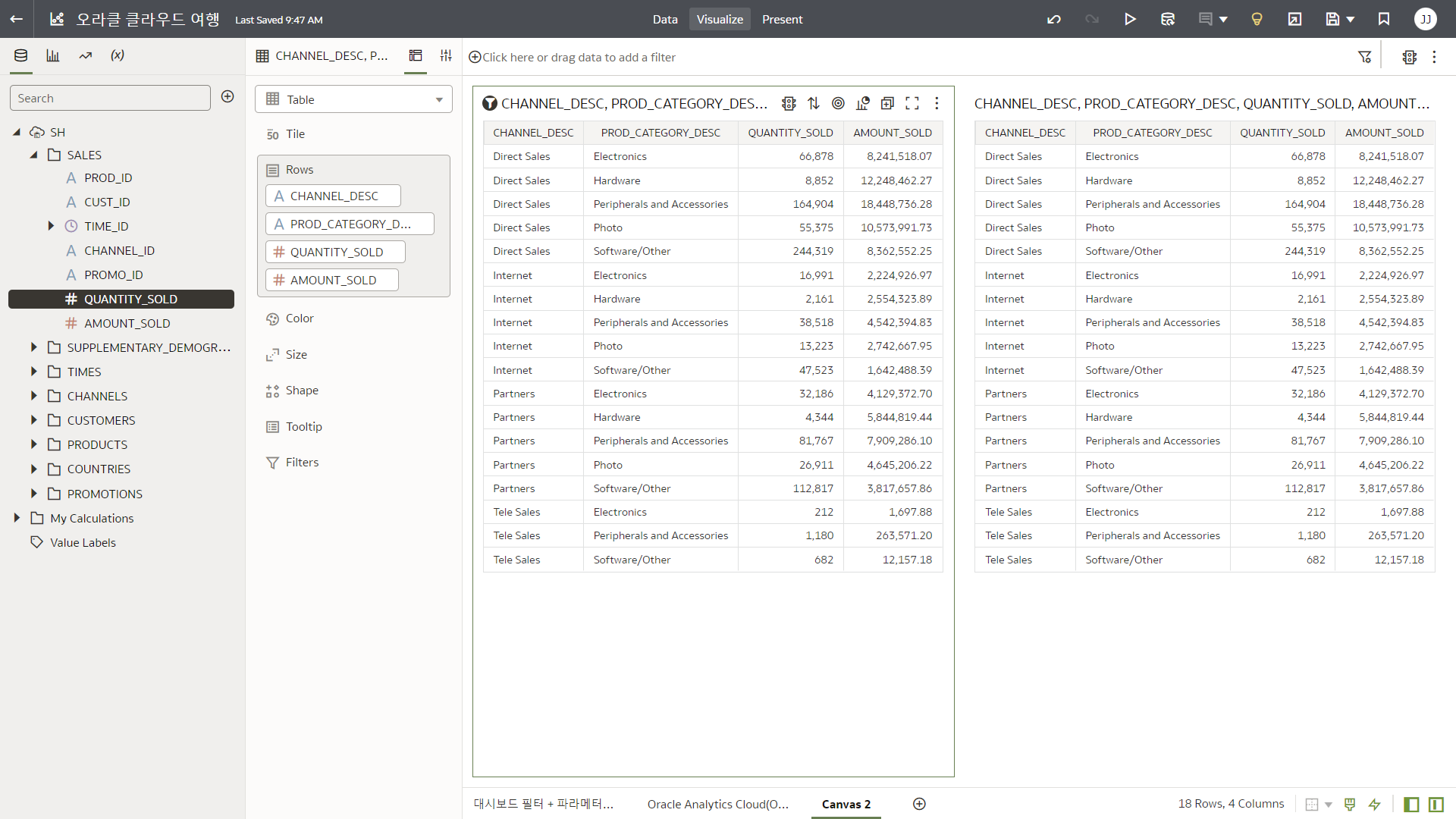 아래와 같이 채널별, 제품 카타고리별 판매수량 및 판매금액에 대한 간단한 테이블 차트를 구성 해 보겠습니다.