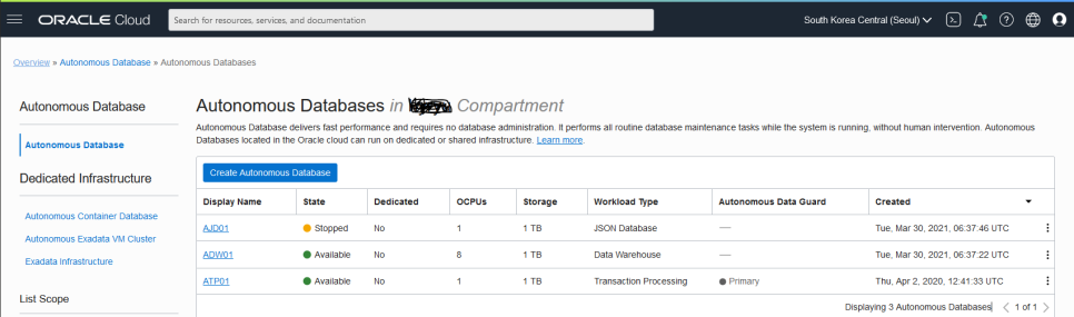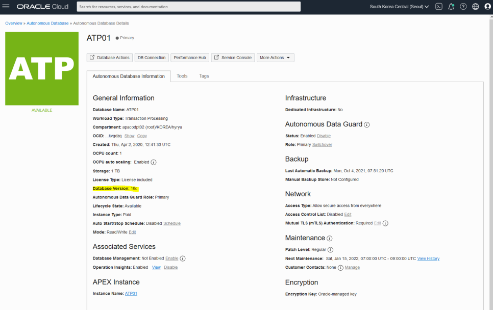 앞서 말씀드린대로 Automatic Indexing 기능은 현재 Exadata 기반의 Oracle Database에서만 제공되고 있습니다. Exadata 환경을 준비할 수 없어서 오라클 클라우드 상에서 Autonumous Transcation Processing(이하 ATP)* 생성해서 진행했습니다.
