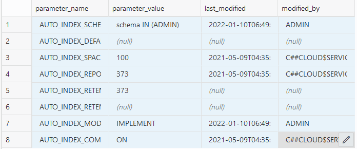EXEC DBMS_AUTO_INDEX.CONFIGURE('AUTO_INDEX_SCHEMA', 'ADMIN');