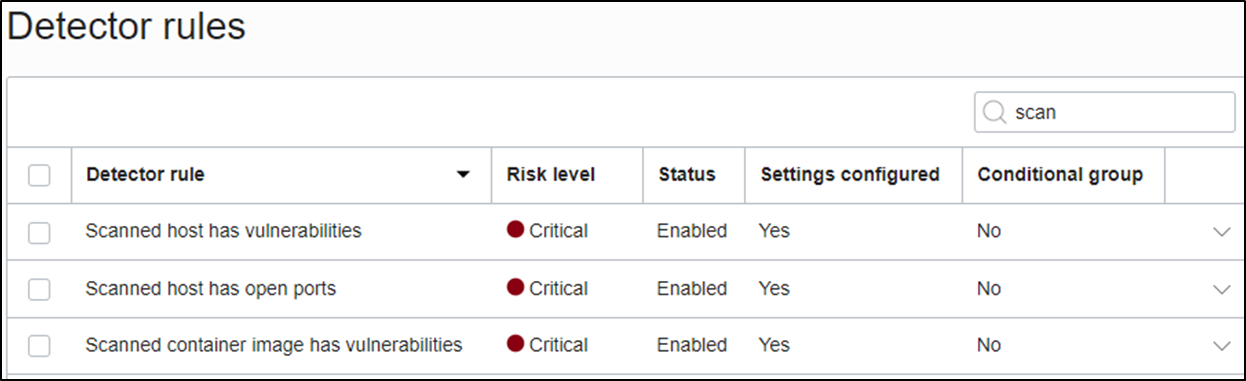 OCI Configuration Detector Recipe내에 아래 세개의 scan detector rule을 Enabled시키면 Vulnerability Scanning에서 스캔된 취약점을 Cloud Guard에서 Problems으로 조회할 수 있다.