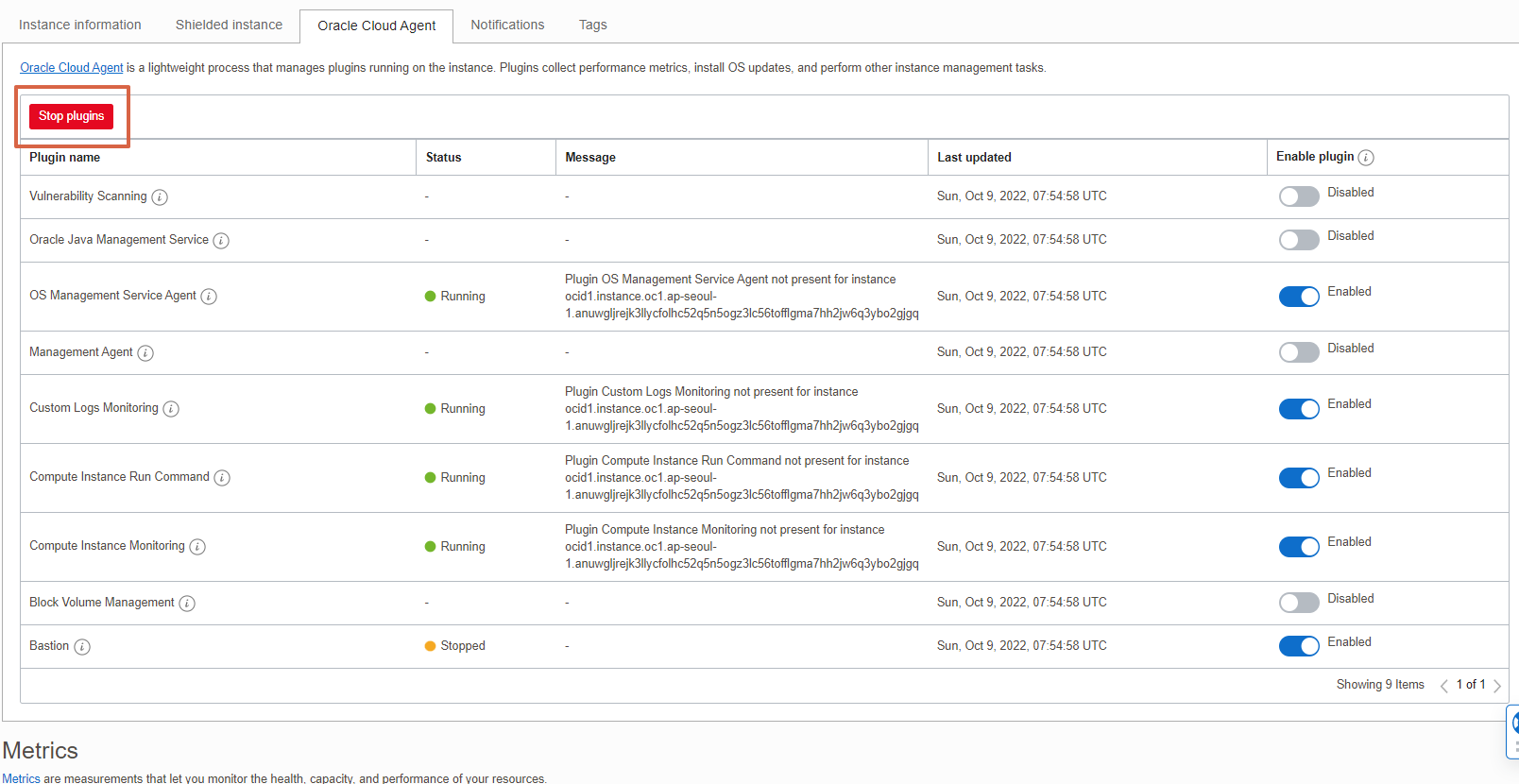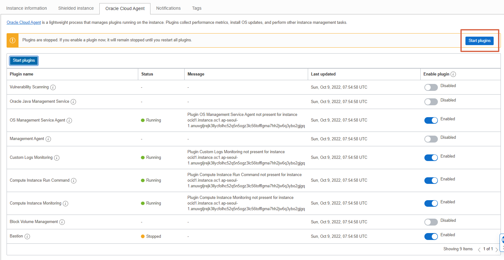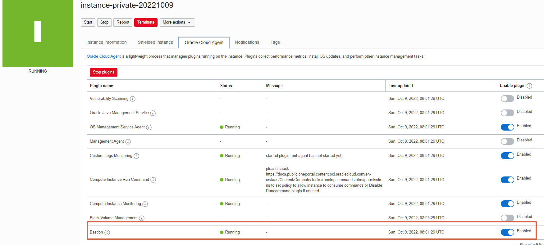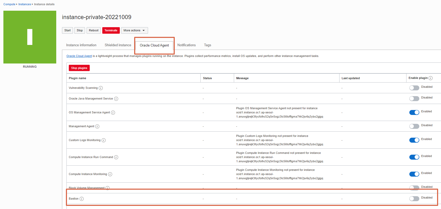 인스턴스 상세에서 Oracle Cloud Agent >> Bastion 서비스 Enable 시키고 >> (10분 정도 기다리면 서비스가 올라온다고 하는데, 기다리지 않고) >> Stop Plugin >> Start Plugin >> 그런 후 인스턴스 재시작하면 Bastion 서비스가 Enable 되어 있고 Running 상태로 됨