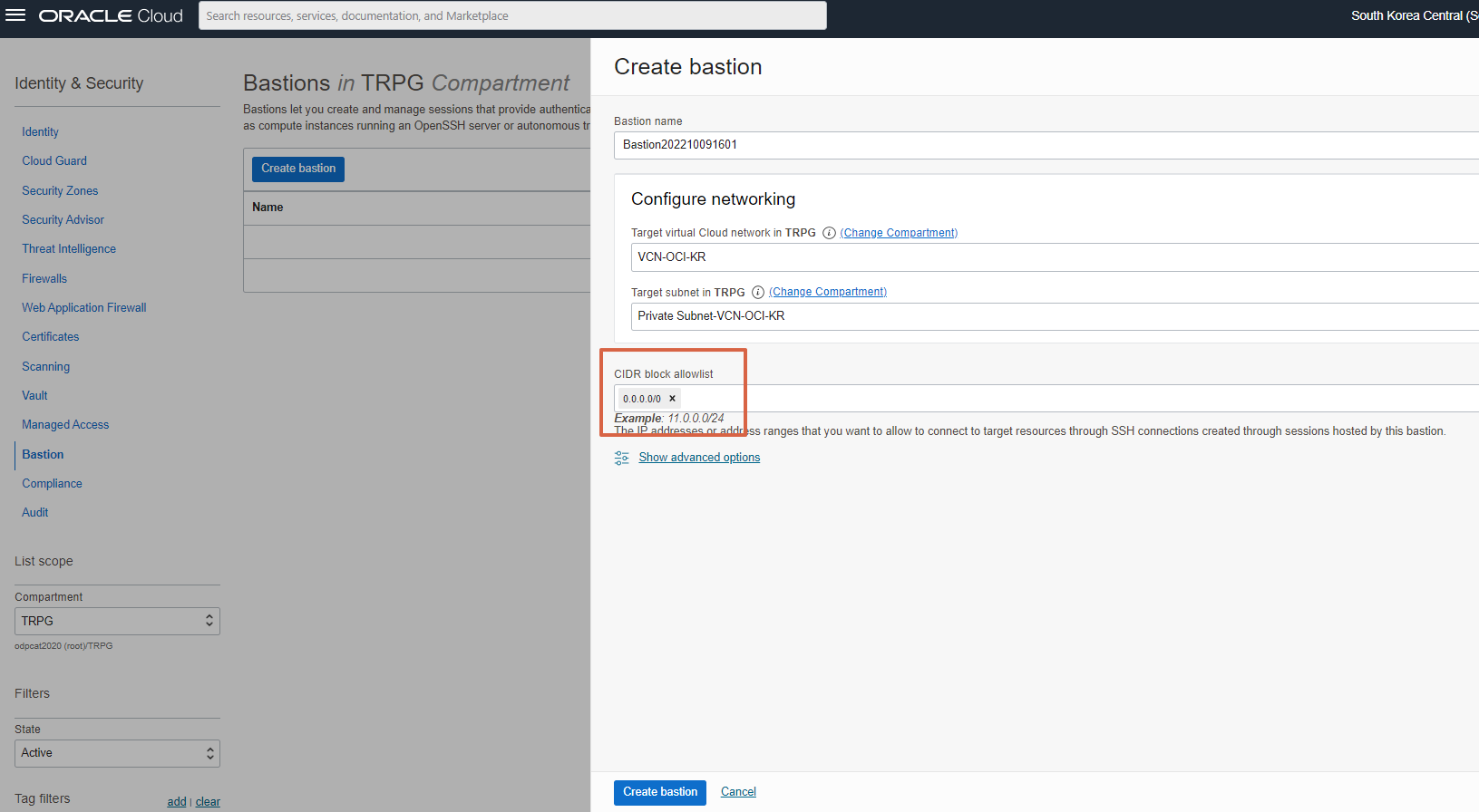 이름, 타켓 네트워크, 서브넷 그리고 Bastion 서비스를 접근 허용하는 IP 대역