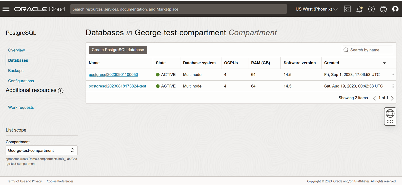 하나 이상의 OCI VM 컴퓨팅 인스턴스에서 실행되는 PostgreSQL 데이터베이스 클러스터입니다. 데이터베이스 시스템은 프로비저닝, 백업 및 복원, 모니터링 등과 같은 작업을 관리할 수 있는 인터페이스를 제공합니다. 각 데이터베이스 시스템에는 읽기/쓰기 PSQL 쿼리에 대한 엔드포인트가 하나 있고 읽기 전용 쿼리에 대한 엔드포인트가 여러 개 있을 수 있습니다.
