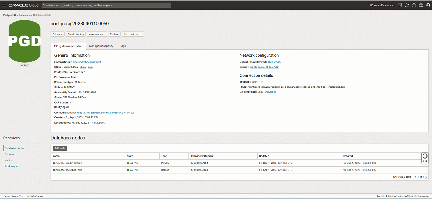PostgreSQL 기반 OCI 데이터베이스는 여러 노드를 사용할 때 고가용성을 제공하도록 설계되었습니다. 장애 조치는 거의 즉각적입니다.