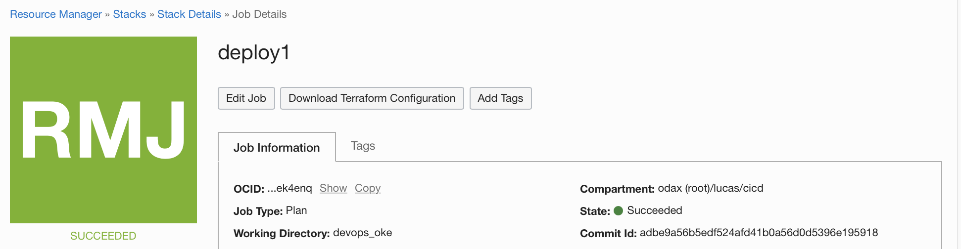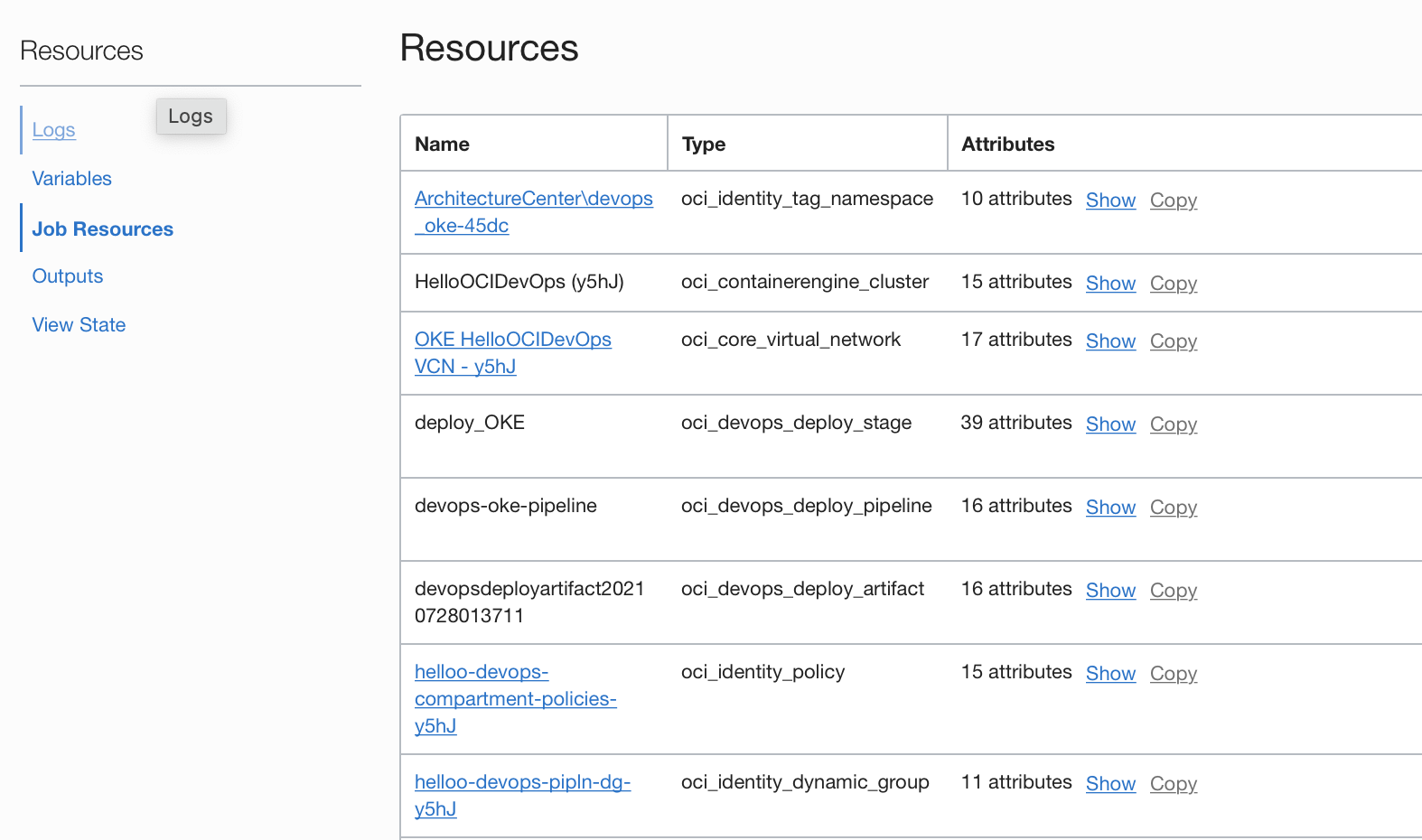 5. 작업이 성공하면 작업 리소스 메뉴를 클릭하여 프로비저닝된 인프라 리소스 목록을 시각화할 수 있습니다.