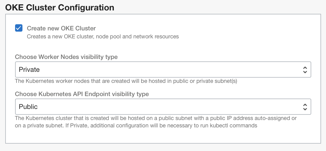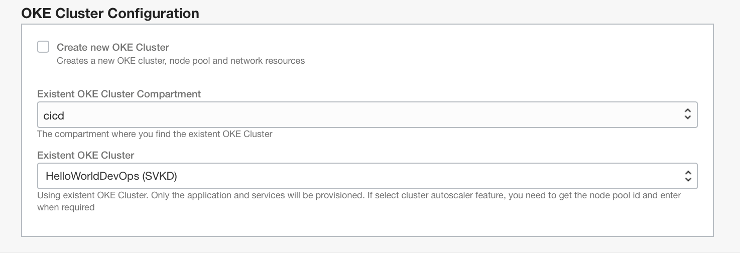 기존 OKE 클러스터를 재사용하려면 새 OKE 클러스터 생성을 선택 취소한 다음 클러스터가 배포된 구획과 클러스터를 선택합니다.